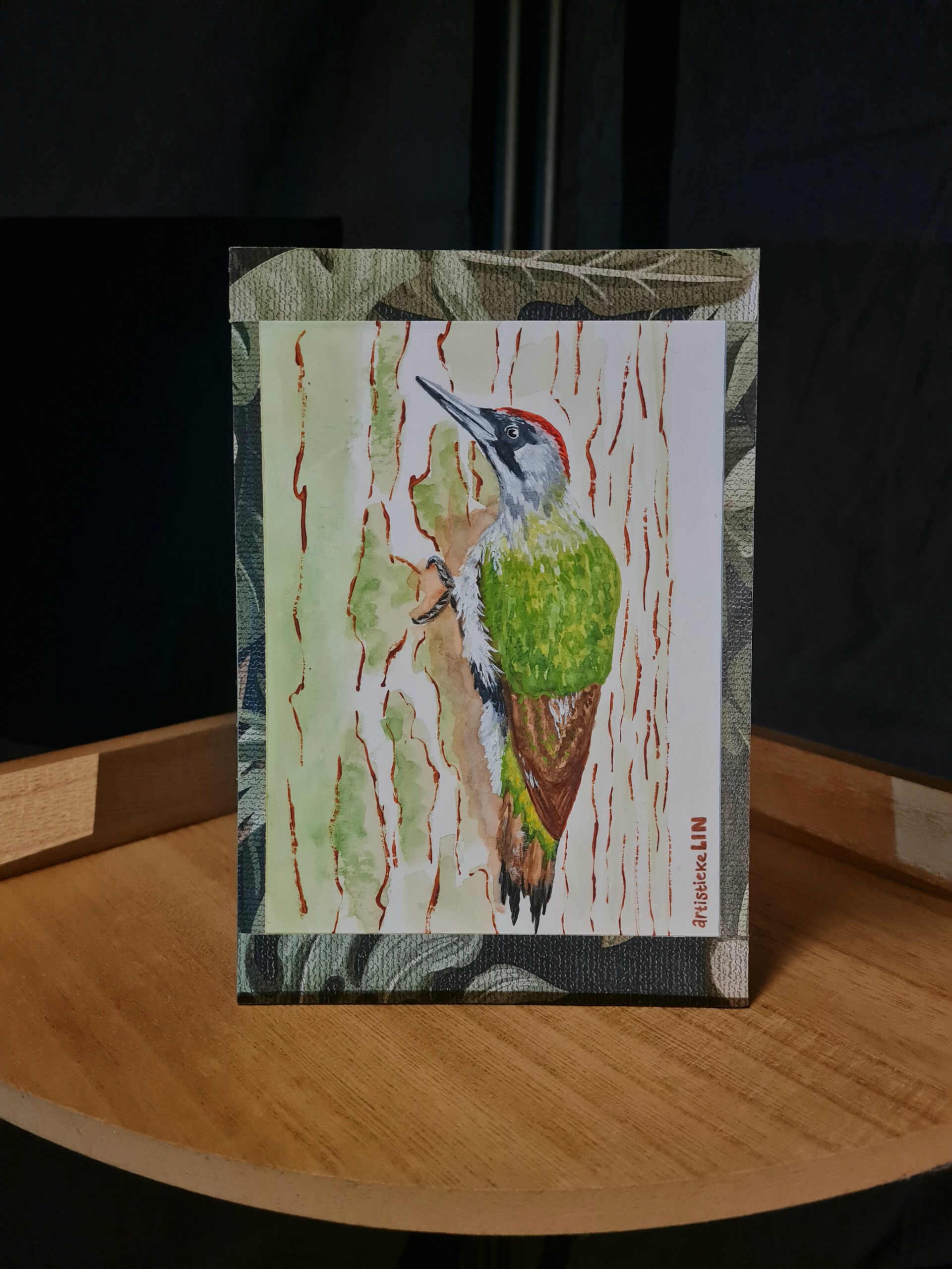 Dit schilderijtje genaamd “groene specht” is op een stevig karton bevestigd en omrand door hergebruikt behang.