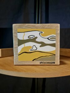 Dit blok hout is beschilderd met een gezellige, kleurrijke print.